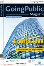 Nach den beiden erfolgreichen Ausgaben im Frühjahr 2006 und 2007 erschien die Sonderausgabe „G-REITs“ im dritten Jahrgang zu einem spannenden Zeitpunkt. Die 2008er Ausgabe steht unter dem Motto „Erste Schritte am Kapitalmarkt“. Wie schon zuvor in Ländern wie Großbritannien (2007), Frankreich (2003), Japan (2000) oder im Mutterland der Real Estate Investment Trusts (kurz REITs), in den USA (seit 1960), verfügt der deutsche Kapitalmarkt mit der 2007 gesetzlich beschlossenen Einführung von REIT-Strukturen nun über eine potenziell völlig neue Assetklasse, aber erst zwei notierte Gesellschaften. Real Estate Investment Trusts stellen eine Transfermöglichkeit von illiquidem Immobilienvermögen in handelbare Wertpapiere dar. Da ein G-REIT die Unternehmensgewinne per Gesetz zu 90% wieder an seine Anteilseigner ausschütten muss, sind Kapitalerhöhungen, also Aktienplatzierungen, die einzige Möglichkeit für die jeweiligen Unternehmen, eine weitere Expansion zu ermöglichen. Obwohl das deutsche G-REIT-Gesetz im Frühsommer 2007 in Kraft trat, nutzten per Ende 2007 erst zwei Unternehmen die Möglichkeit zu einer Umwandlung in einen REIT. Allerdings ändern sich die steuerlichen Rahmenbedingungen mit der ab 2008 in Kraft getretenen Unternehmenssteuerreform nochmals. Diese nämlich hat großen Einfluss auf die sogenannte Exit Tax, die Immobilienverkäufe an G-REITs bzw. deren Vorläufer steuerlich begünstigt. Der eigentliche Startschuss für den deutschen REIT fällt damit de facto erst jetzt im Jahr 2008. Die Sonderausgabe des GoingPublic Magazins will Transparenz und Know-how vermitteln, als Plattform und Mittler zwischen Finanzindustrie und Immobilienwirtschaft fungieren und erhebt den Anspruch, das jährliche Nachschlagewerk rund um den deutschen REIT zu sein.